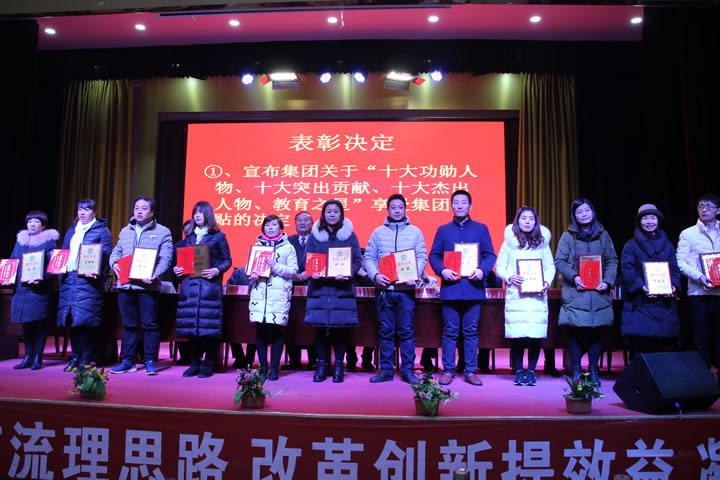 集团学工部李德忠部长在宣读集团关于“十大功勋人物、十大突出贡献、十大杰出人物、教育之星”享受集团津贴的决定中指出,2016年在二十年校庆中评选了集团“十大功勋人物奖、十大突出贡献奖及十大杰出人物奖”,2017年初,在此基础上,又评出一批集团教育之星。2018年1月经各校推荐,集团委员会研究,又新增了24名教育之星,这些同志都是集团的功臣,他们都是各校的骨干和精英,这些奖项是他们在集团工作期间的终身荣誉,他们是我们学习的榜样,希望全体教职员工以榜样为动力,以更加饱满的激情、更加努力的决心去拼搏,去奋战,为集团事业的蓬勃发展做出贡献。